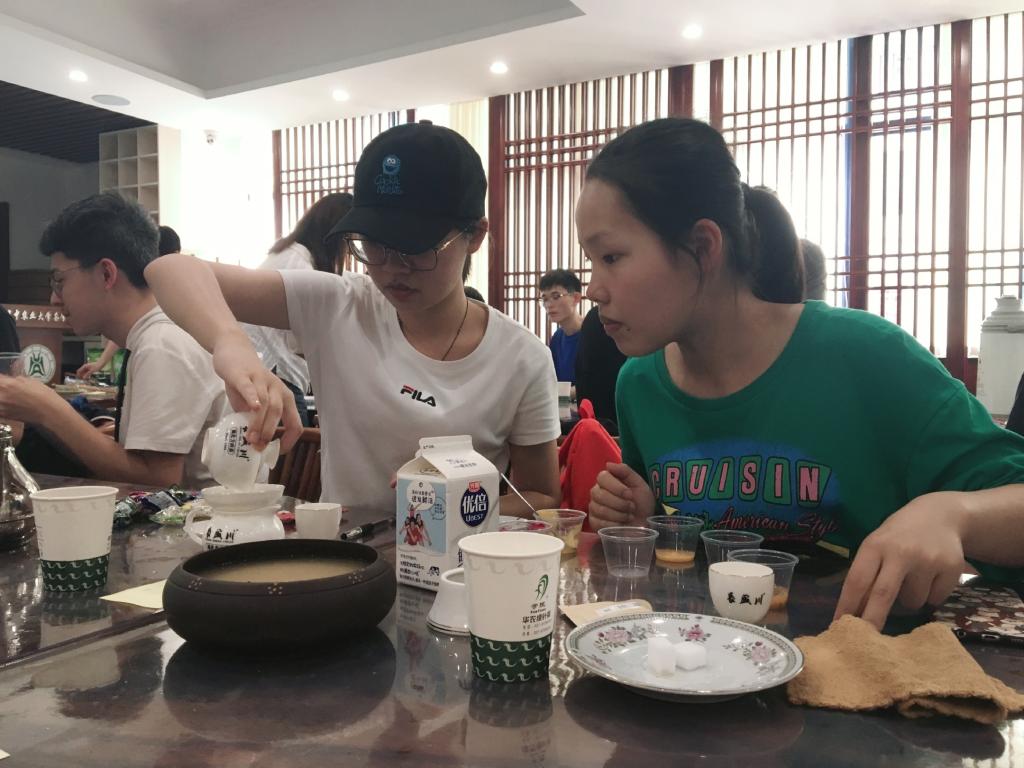 温杯,投茶,冲泡,出汤,看过冲泡演示后,参与者们学得有模有样。在负责人的指导下,参与者们向泡好的红茶中小心地加入牛奶和糖,每加入一定量牛奶和糖后都倒出一小杯品尝,以确定是否制作完成。25分钟后,红茶奶茶调饮环节结束,参与者们互相品尝作品并打分。