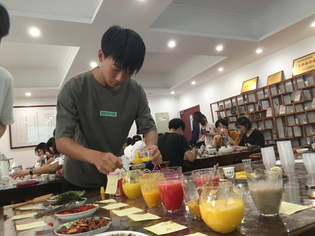 45分钟的创意调饮环节中,主办方提供了绿茶、红茶、乌龙茶等茶叶及百香果、玫瑰等二十余种其他材料供参与者们自由搭配。十二组选取了蜂蜜、玫瑰与乌龙茶的经典搭配,茶香醇厚,滋味甘甜;十一组选取了荷叶与茉莉花茶的和谐搭配,茶汤澄碧,沁人心脾;三组将百香果、芒果等果汁融入茶中,酸甜的果味与醇厚的茶香巧妙结合;四组另辟蹊径,选取生姜等材料,经调配后竟也别有一番风味。陈玉琼教授品尝各组的作品并提出建议,她表示,选取材料时要注意其他材料的香气、味道与茶是否和谐,并注意投放比例,这样才能制作出好的调饮茶。