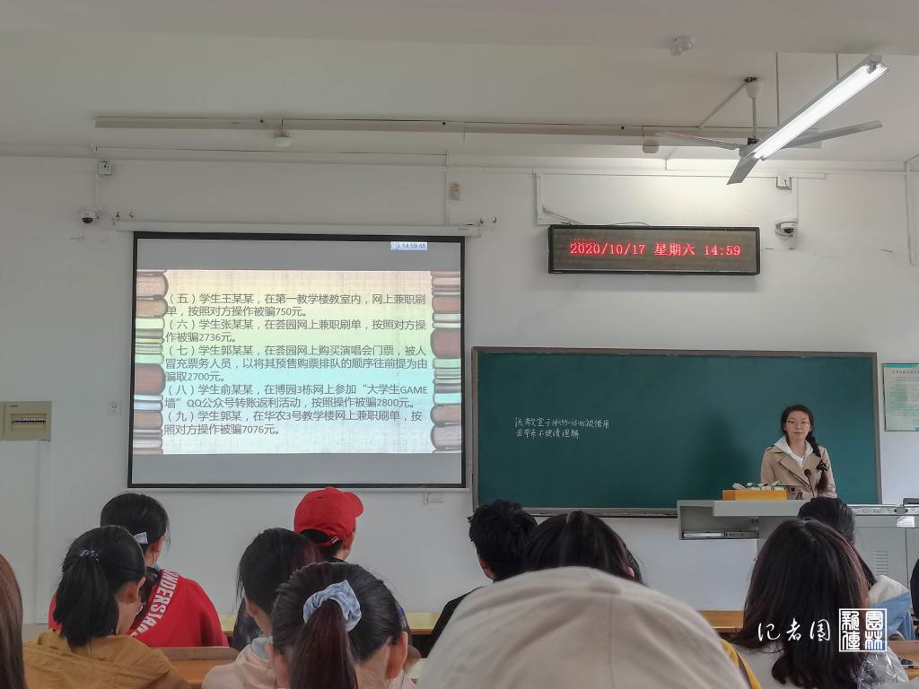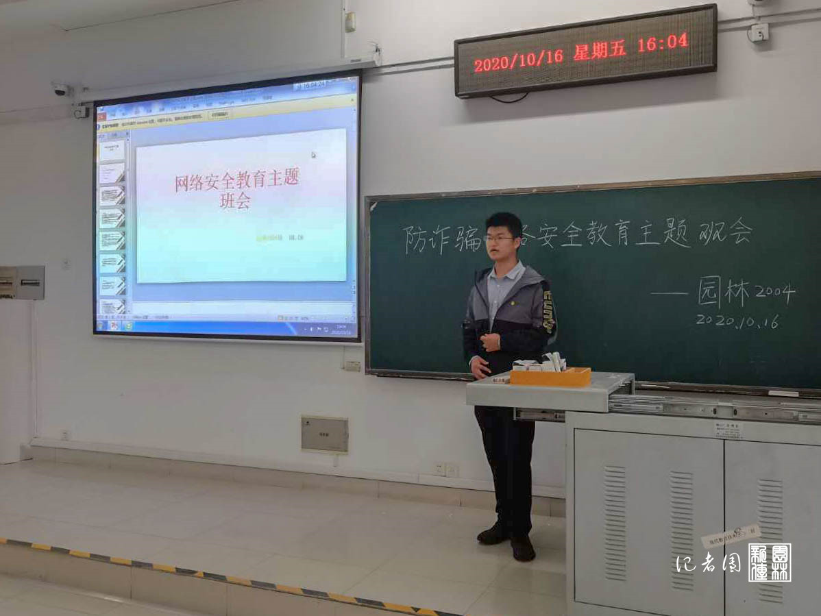 近期本科生网络电信诈骗案件时有发生,为切实增强学生金融风险防范意识,提升抵御网络电信诈骗能力,2020年10月16日—10月18日,51吃瓜网 2020级14个班级分别在班长支书的组织下开展了以“防范网络电信诈骗,共建和谐安全校园”为主题的班会。