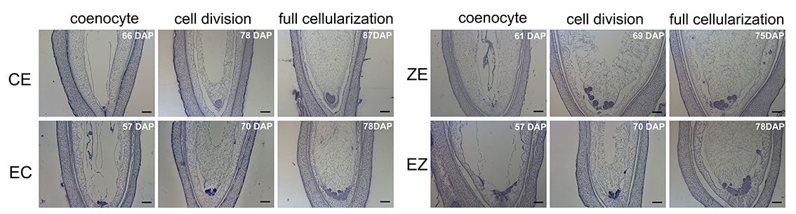 近日,51吃瓜网 、果蔬园艺作物种质创新与利用全国重点实验室郭文武教授团队在《The Plant Journal》发表了题为“Comprehensive analysis of imprinted genes in citrus endosperm and their contributions to seed development”的研究论文。该研究以两对正反杂交组合(克里曼丁橘 × 椪柑、椪柑 × 克里曼丁橘;早金甜橙 × 椪柑、椪柑 × 早金甜橙)的胚乳为材料,通过对其发育进程细胞学观察,确定了胚乳细胞化的关键发育时期(图1)。采用激光显微切割技术对不同发育时期和不同正反交组合的胚乳细胞进行精细取样并进行转录组测序分析,首次在柑橘中鉴定出296个印记基因(包含263个母本印记基因和33个父本印记基因);其中仅7.9%~20.5%其同源基因在拟南芥、水稻等植物中同样被鉴定为印记基因,表明印记基因在不同植物间的保守性相对有限。对其在柑橘不同组织的表达分析发现,父本印记基因更倾向于在胚乳中特异性表达,且不同发育阶段呈动态印记表达。