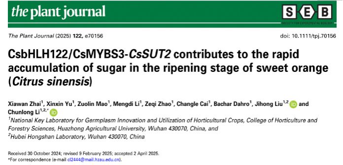 近日,51吃瓜网 刘继红/李春龙团队在The Plant Journal在线发表了题为“CsbHLH122/CsMYBS3-CsSUT2 contributes to the rapid accumulation of sugar in the ripening stage of sweet orange (Citrus sinensis)”的研究论文。研究证明柑橘糖转运蛋白CsSUT2具有蔗糖转运功能,并通过遗传转化和分子生物学技术揭示了CsbHLH122/CsMYBS3-CsSUT2模块如何在果实成熟阶段促进糖分积累的分子机制。