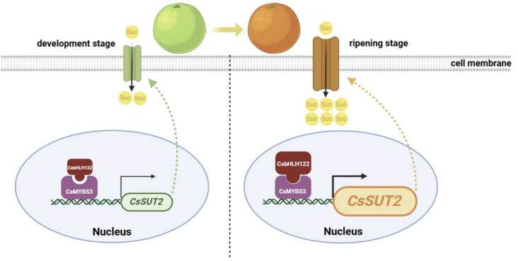 糖是决定果实风味品质和营养价值的基本代谢成分,然而柑橘果实成熟过程中糖分快速积累的调控机制仍不清楚。碳源在果实中的运输和分配由蔗糖转运蛋白(SUTs)介导,这些蛋白在“源-库”关系中起着关键作用。