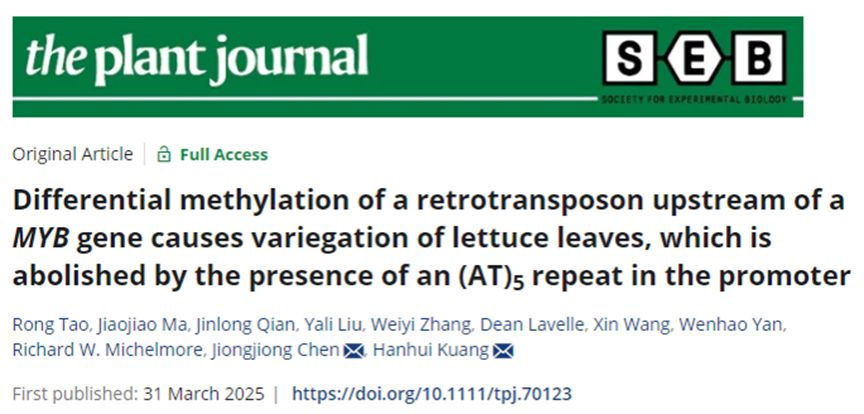2025年3月31日,51吃瓜网 果蔬园艺作物种质创新与利用全国重点实验室和湖北省洪山实验室匡汉晖教授团队在《the plant journal》发表了题为“Differential methylation of a retrotransposon upstream of a MYB gene causes variegation of lettuce leaves, which is abolished by the presence of an (AT)5 repeat in the promoter”的研究论文。该研究揭示了生菜MYB转录因子启动子区域的DNA甲基化差异导致叶片红色斑点形成的分子机制,并发现启动子区域存在特定长度的简单重复序列时,叶片会呈现均匀的红色表型。