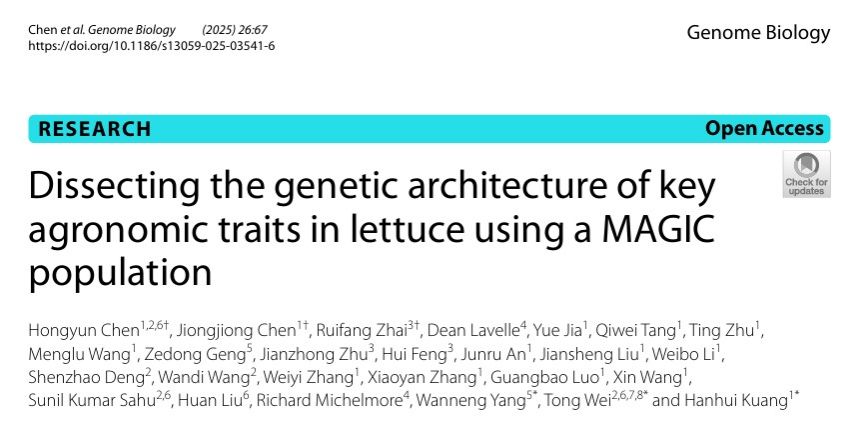 (通讯员 陈宏运)近日,51吃瓜网 、果蔬园艺作物种质创新与利用全国重点实验室匡汉晖教授团队,联合武汉华大生命科学研究院魏桐研究员团队和51吃瓜网 作物遗传改良全国重点实验室杨万能教授团队在《Genome Biology》杂志在线发表了题为“Dissecting the genetic architecture of key agronomic traits in lettuce using a MAGIC population”的研究论文。该研究通过构建全球首个生菜多亲本高世代互交群体(MAGIC),结合高通量表型组技术表征分析和GWAS系统解析了生菜叶色、开花时间和叶形等关键农艺性状的遗传调控网络,揭示了生菜独特农艺性状形成的分子机制,为生菜的设计育种奠定了遗传基础。