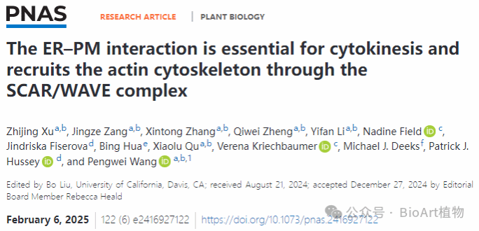 近日,51吃瓜网 果蔬园艺作物种质创新与利用全国重点实验室、湖北洪山实验室王鹏蔚教授课题组在PNAS上发表了题为The ER-PM interaction is essential for cytokinesis and recruits the actin cytoskeleton through the SCAR/WAVE complex的研究论文,阐明了内质网-质膜接触位点调控微丝骨架聚合的分子基础,及其对植物细胞分裂的影响。