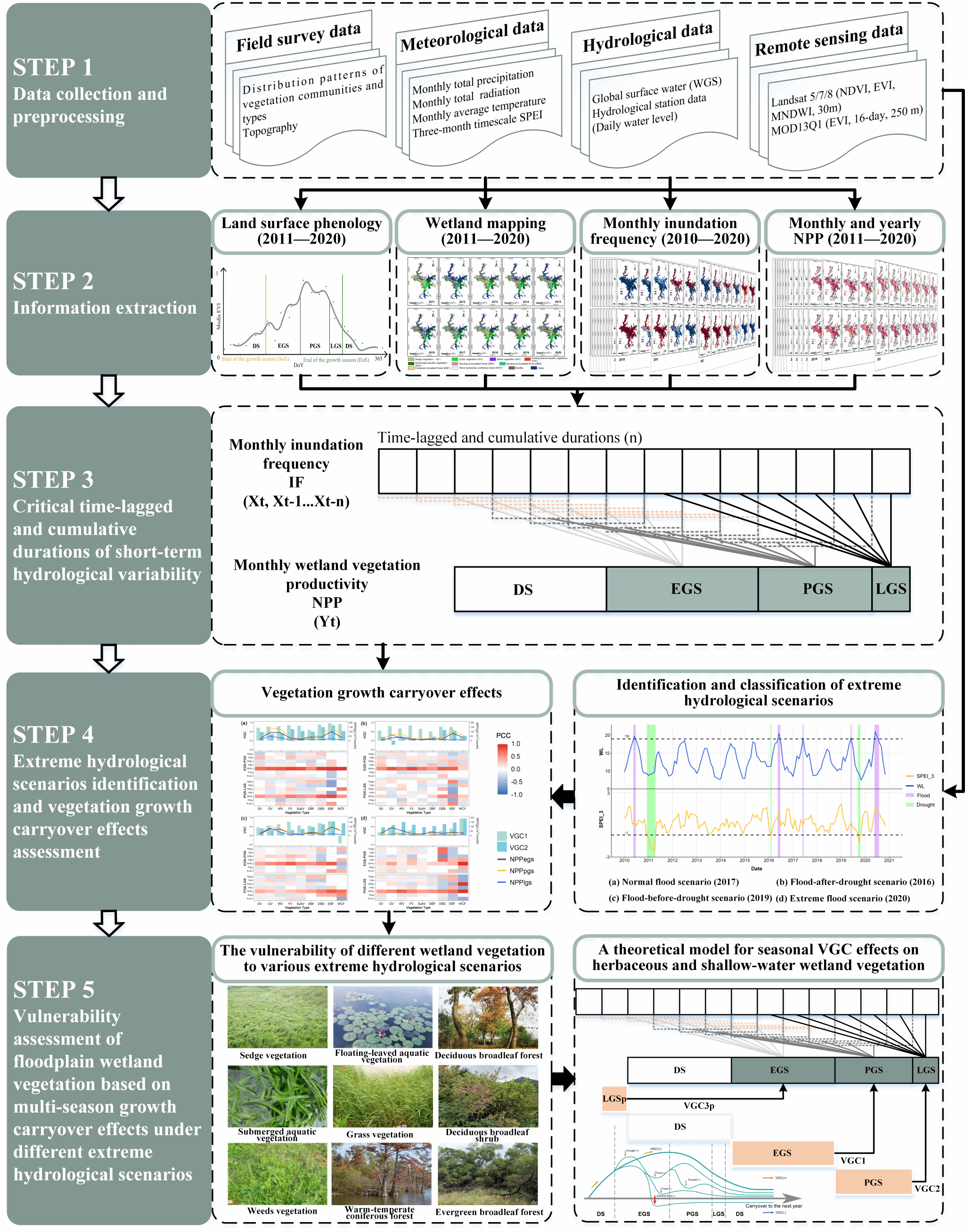 第四, 由于在植被碳吸收过程中非结构性碳水化合物 (NSCs) 和结构性碳水化合物 (SCs) 的功能差异,上一季的生物量残留可以通过 NSCs 的储存和动员来帮助湿地植被抵御当季的不利条件。研究提出使用多季节植被生长转结效应以评估洪泛平原湿地对多种极端水文情景的脆弱性,突破了传统“植被绿度即生态健康”的单一认知。