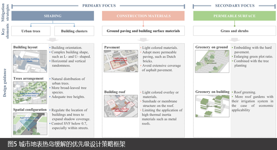 在建成环境内部,基于随机森林模型的结果显示,地块尺度的LST变化主要受2D景观组分尤其是绿地覆盖率的驱动。与之相反,在精细尺度的不透水活动空间层面,3D空间构型因其遮荫调控能力而主导LST变化,并以天空开阔度(Sky view factor,SVF)为最关键的增温因子且其效率阈值约为0.7。对于城市户外降温,该结果表明综合调控城市建筑及周边绿化的空间布局以扩大遮荫比以往单一强调增加绿地覆盖或降低建筑密度更加高效。此外,虽然基于卫星观测的大量研究通过构建缓冲区分析了具有不同斑块特征的大型蓝绿空间的最大冷却距离及强度,但在高精度无人机热红外观测分析视角下,该类空间对相邻建成环境内不同下垫面材质表面温度的影响不具有显著性。最后,针对空间层面的关键城市表面降温技术,研究提供了一套具有优先序列的设计策略框架,为城市规划设计师更高效地改善户外热环境提供决策辅助和技术支持。