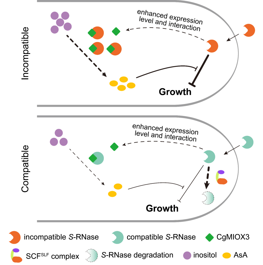体内及体外互作验证结果表明CgMIOX3与不同单倍型的S-RNases存在广泛互作,二者的成熟蛋白在花粉管的细胞质中共定位。下调CgMIOX3的表达会显著抑制花粉管的正常生长,而施加重组CgMIOX3蛋白则可以显著提高花粉管内抗坏酸(Ascorbic acid, AsA)的水平、增加H2O2处理下花粉管的萌发率和生长长度,表明CgMIOX3对柚花粉管的正常生长发挥了重要作用。研究发现亲和与不亲和反应都会引发花粉管内CgMIOX3的上调表达,同时S-RNases与CgMIOX3结合后可以增强后者的对肌醇的催化活性。降低CgMIOX3表达会导致发生亲和反应的花粉管生长也受到明显抑制,相反施加重组CgMIOX3蛋白或外源AsA则可以显著增加发生不亲和反应的花粉管长度。此外,转化了CgMIOX3的不亲和矮牵牛也表现出了自交授粉后花粉管生长长度明显变长的表型。以上结果表明CgMIOX3通过表达水平增加、活性增强的途径响应了S-RNases进入花粉管后发出的SI信号,并通过催化肌醇降解促进AsA的合成,从而在一定程度上缓解了S-RNase对花粉管生长的抑制作用。