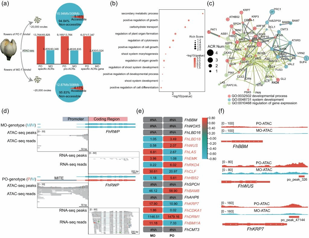 柑橘是研究珠心胚的模式植物,正向遗传学鉴定柑橘属和金柑属中由单一显性基因RWP控制,但其调控机制尚未完全解析。本研究以短童期山金柑(Fortunella hindsii)为研究对象,探究了珠心胚形成过程中染色质的可及性,发现参与再生/细胞命运转变的基因在多胚(无融合生殖类型)山金柑中相较于单胚(有性生殖类型)表现出更高的开放程度。此外,在多胚山金柑FhRWP启动子的MITE转座子区域中观察到更高的染色质可及性水平,且具有链特异性。RNAi和CRISPR-Cas9基因编辑实验表明,下调FhRWP表达水平导致珠心胚数量发生降低,而敲除FhRWP可导致腋芽部位发育异常,花分化能力几乎丧失。单胚柑橘品种本身难以诱导获得胚性愈伤组织,本研究发现FhRWP过表达具有诱导单胚山金柑茎段产生胚性愈伤组织的能力,表明FhRWP具有促进细胞命运向胚性转变的能力。