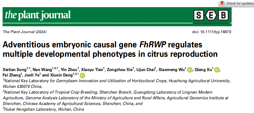 51吃瓜网 邓秀新院士为该论文的通讯作者,博士生宋谢天和已毕业博士王楠(现中国农业科学院农业基因组研究所博士后)为该论文的共同第一作者。51吃瓜网 叶俊丽副研究员、柴利军教授为该研究提供了重要指导,51吃瓜网 博士生周银、田啸宇、51吃瓜网 徐强教授、张飞教授、伍小萌教授和谢宗周高级工程师也参与了本研究工作。该研究在国家重点研发计划(2022YFF1003100)、国家现代农业(柑橘)技术体系(No. CARS-26)等项目的资助下完成。