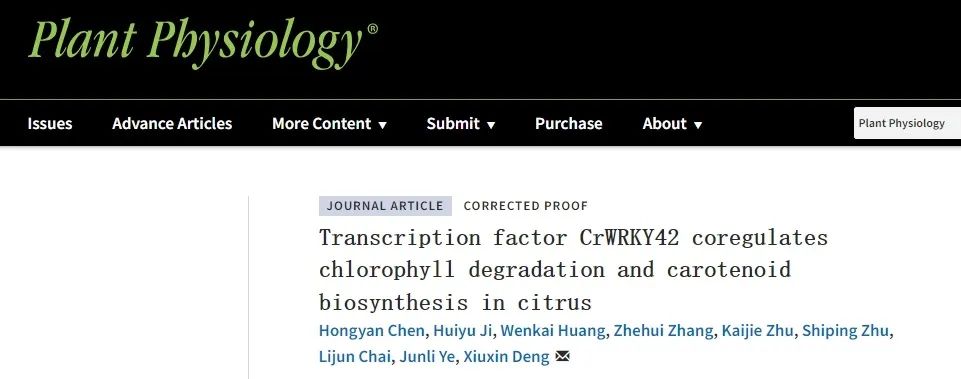 近日,51吃瓜网 /果蔬园艺作物种质创新与利用全国重点实验室邓秀新院士团队在Plant Physiology在线发表了题为“Transcription factor CrWRKY42 coregulates chlorophyll degradation and carotenoid biosynthesis in citrus”的研究论文。该研究解析了转录因子CrWRKY42通过协同调控叶绿素降解和类胡萝卜素生物合成途径促进柑橘果实着色的分子机制,该研究结果为柑橘果实色泽品质遗传改良提供了理论依据和重要基因资源。