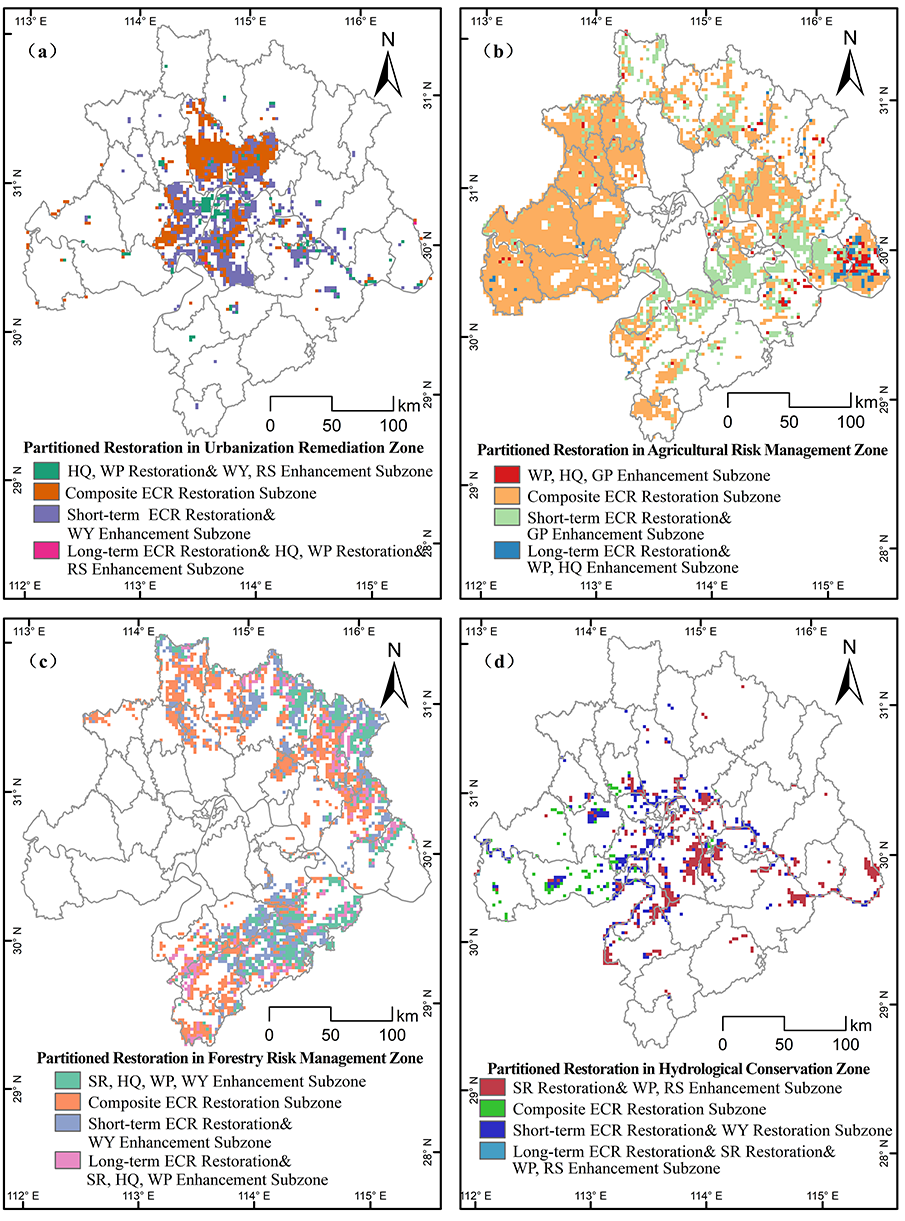 研究根据2001-2020年WMA的ESB动态演变特征划定了二级主导生态功能分区。在此基础之上,以ECR阈值作为判定规则进行气候适应性生态修复分区。最终,将ECR与ES整合进空间识别,并以城市生态修复区、水资源保护区、农业建设区以及林业建设区四个WMA主要二级分区为例,完成了气候适应性生态修复分区制图。