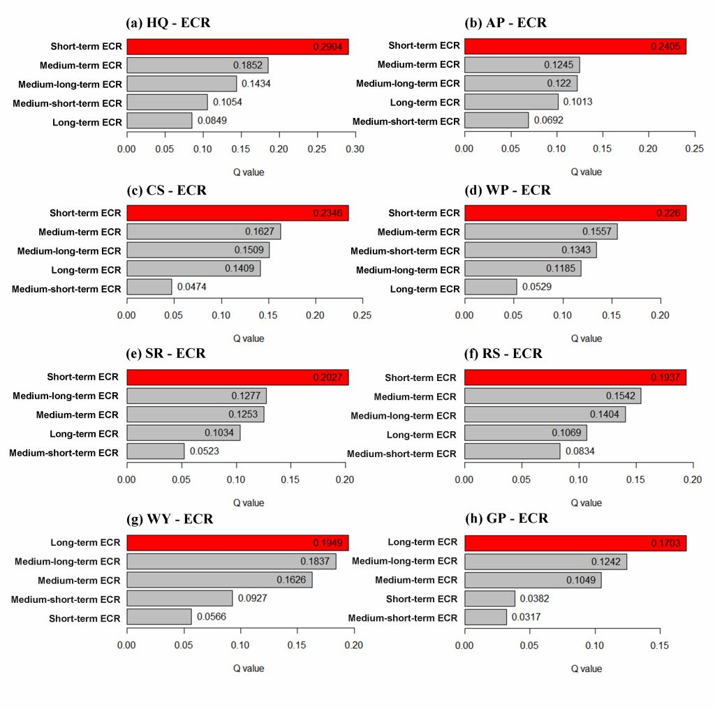 此外,ECR与不同ES之间的非线性权衡关系和临界阈值也有差异。对所有的ECR阈值取交集,长期ECR小于0.445和短期ECR介于0.38-0.47是WMA的ECR与多种ES之间协同的阈值,在此阈值范围内ECR与HQ、AP、CS、WP、SR、R、WY七个ES都具有协同关系。而GP与长期ECR之间没有明显的阈值效应,两者是显著的权衡关系。
