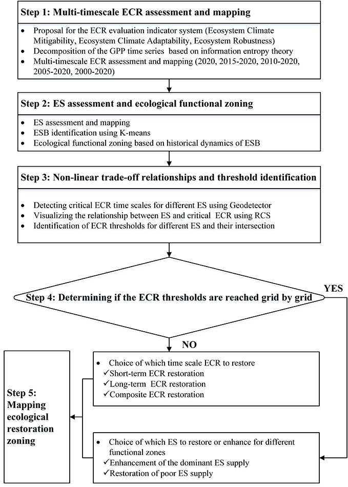 图1. 整合ES与ECR的非线性权衡关系和关键阈值的气候适应性生态修复分区框架