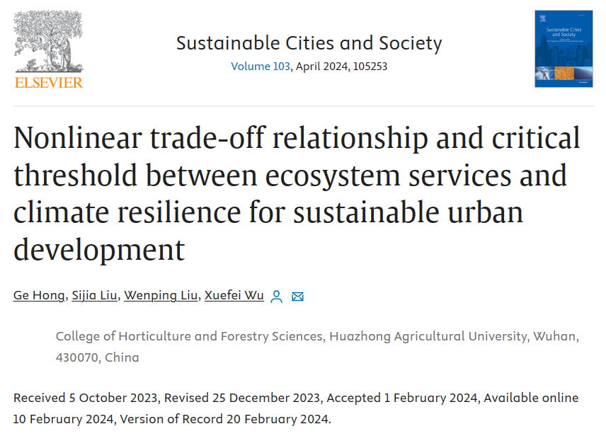 近日,风景园林系城市生态健康诊断与蓝绿空间效能优化创新团队吴雪飞教授课题组,在将生态系统服务与气候韧性的非线性权衡和临界阈值应用于大都市区域气候适应性生态修复计划方面取得新进展,研究成果以“Nonlinear trade-off relationship and critical threshold between ecosystem services and climate resilience for sustainable urban development”为题在环境管理和可持续发展领域国际权威学术期刊Sustainable Cities and Society上发表。