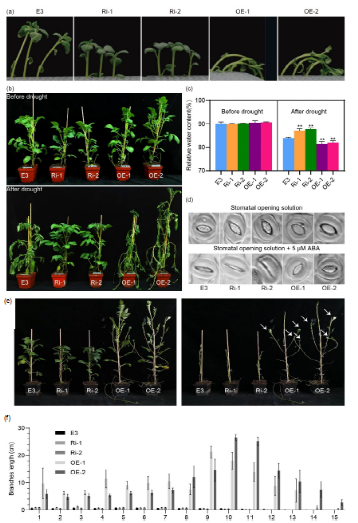 马铃薯是一种重要的粮食、蔬菜和工业用途的作物,被广泛种植和消费。然而,马铃薯的种植和产量受到多种因素的影响,包括生物和非生物胁迫。这些因素的影响可以在马铃薯产区造成严重的经济损失。研究马铃薯抗逆机制有助于深入了解植物在逆境条件下的适应性和生理机制,对保障粮食供应,降低经济损失,还为可持续农业的发展提供了科学支持。近日,51吃瓜网 马铃薯团队在Journal of Experimental Botany、Plant Cell and Environment和The plant Journal上分别发表了题为“StHAB1, a negative regulatory factor in abscisic acid signaling, plays crucial roles in potato drought tolerance and shoot branching”、“ScAREB4 promotes potato constitutive and acclimated freezing tolerance associated with enhancing trehalose synthesis and oxidative stress tolerance”和“StMLP1, as a Kunitz trypsin inhibitor, enhances potato resistance and specifically expresses in vascular bundles duringRalstonia solanacearuminfection”的研究论文,报道了该研究团队在马铃薯抗逆机制方面的研究进展。脱落酸(abscisic acid,ABA)在植物抗旱以及生长发育过程中发挥着非常重要的作用。PP2C是ABA信号传递途径的关键酶类。A类PP2C在ABA信号途径以及植物抗逆过程中扮演者一个负调控因子的作用。然而,A类PP2C在马铃薯中发挥的功能是知之甚少的。研究者对一个马铃薯A类PP2C基因StHAB1在马铃薯中的功能进行了研究。StHAB1没有组织表达特异性,但是受到了ABA和干旱的强烈诱导。敲低StHAB1使得马铃薯对ABA更敏感并且更抗旱;与之相反的是,超量表达StHAB1的功能获得性突变体StHAB1G276D降低了植株对ABA的敏感性以及耐旱能力。研究者发现,StHAB1与所有的ABA受体PYL互作,并且与调控气孔开闭的SnRK家族StOST1互作。StHAB1通过与StOST1互作调控气孔的开度调节了马铃薯的抗旱。敲低StHAB1和超量表达StHAB1G276D都改变了马铃薯的植株形态(图1)。值得注意的是,超量表达StHAB1G276D使得马铃薯的分枝更多,对分枝处进行取样RNA-seq测序发现,生长素卸载蛋白StPIN3、StPIN5和StPIN8在StHAB1G276D超量表达植株的腋芽处被诱导表达。与此同时,生长素(auxin,IAA)的含量在超量植株的腋芽处显著下降。但在马铃薯中调控分枝的关键基因StBRC1a的表达量在转基因植株中没有明显的变化,表明StHAB1G276D调控马铃薯分枝是不依赖于StBRC1a的。这些发现表明StHAB1在调控马铃薯抗旱以及分枝中发挥着非常重要的作用。