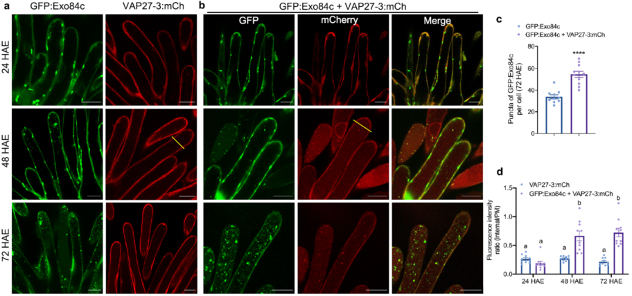 图2. VAP27和Exo84c在衰老的柱头乳突细胞中通过自噬途径降解