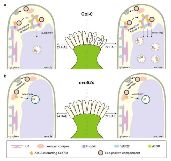 植物胞吐复合体成员参与蛋白分泌及自噬降解过程,具有显著的功能分化特征,对植物发育和生存至关重要。自噬过程的分子机制研究已相对完善,但自噬在植物生殖发育中的功能尚不清楚。本研究解析了开花植物特有的胞吐复合体成员Exo84c,通过与内质网定位蛋白VAP27相互作用,参与植物柱头衰老过程。植物Exo84蛋白有三种亚型,分别为Exo84a, Exo84b和Exo84c,而VAP27特异性与Exo84c互作。拟南芥exo84c突变体柱头细胞衰老延缓,而vap27-1/3双突变体中柱头提前衰老。对衰老过程中柱头乳突细胞进行活细胞成像观察,发现乳突细胞衰老过程中Exo84c与VAP27通过自噬途径进入液泡内降解(图2);同时,Exo84c与VAP27的互作还介导胞吐复合体及其成员通过选择性自噬途径降解(图3),影响柱头细胞的活性,以及有效授粉期。首次从细胞生物学角度揭示了胞吐复合体成员Exo84c参与柱头衰老的调控机制,解析了内质网参与介导胞吐复合体选择性自噬降解的新途径。不仅揭示了自噬途径在花器官衰老过程中的作用,也为通过延长有效授粉窗口保证产量提供了理论依据。