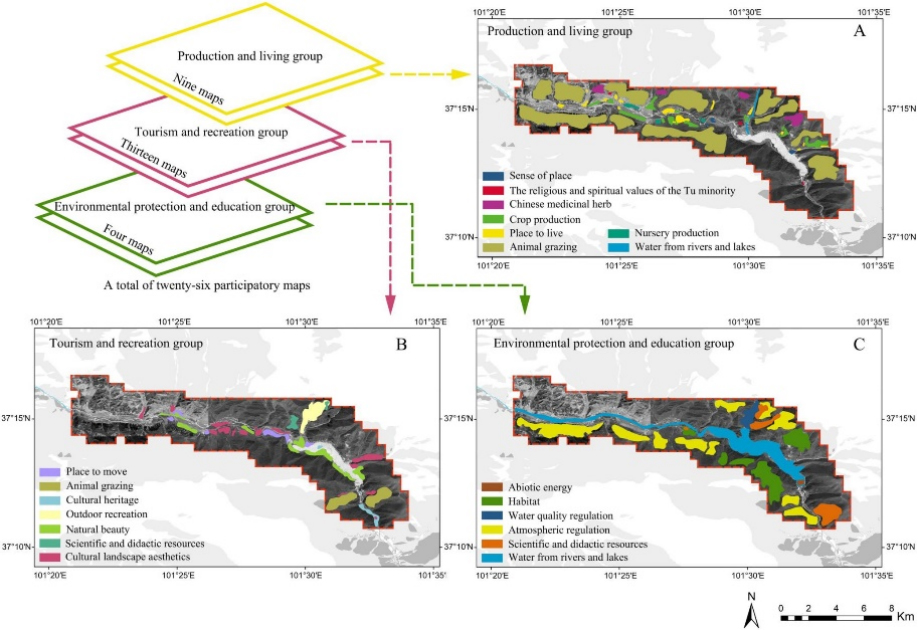 保护地旨在实现多种目标,因此分区规划在保护地管理中日趋重要。然而,目前通用的保护地分区方法与社会-生态系统之间空间尺度的不匹配使这些方法容易导致地方冲突。通用的分区方法只提供单一尺度的分区方案,因此这些分区往往覆盖很大的面积,导致地方社会-生态系统被忽视。本研究旨在为保护地开发和测试一种地方尺度的参与式分区方法以解决地方冲突。本研究提出的方法使用地景服务概念作为框架,首先,逐步的进行利益攸关方分析,以深入了解地方社会-生态系统,具体涉及识别利益攸关方和地景服务类型、对利益攸关方进行区分和归类和调查利益攸关方之间的关系;其次,促进利益攸关方在对上述地方社会-生态系统深入理解的基础上,合作开发一个共识性的分区方案。本研究提出的分区方法在中国的宝库峡进行了测试,识别出宝库峡的18类利益攸关方和25种地景服务;根据不同利益攸关方对地景服务需求的差异将利益攸关方分为三组;并厘清三组利益攸关方之间的空间关系。然后,组织利益攸关方在研讨会上提出了一个由五个分区组成的共识性分区方案。研究的结果表明地方尺度的参与式分区方法可以通过将冲突区域划分为更精确的空间管理单位,并为这些管理单元提供与地方社会-生态系统相匹配的更因地制宜的管理策略,以帮助解决保护地的地方冲突。