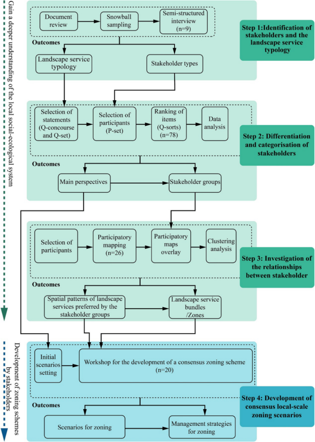 Protected areas (PAs) commonly involve multiple objectives, rendering zoning increasingly important. However, the generalised zoning of PAs leads to local conflicts, often caused by the scale mismatch between the generalised zoning and the social-ecological systems. Generalised zoning approaches offer only single-scale management practices, hence zoning tends to cover large areas where local social-ecological systems are neglected. This study aims to develop and test a local-scale participatory zoning approach for PAs to resolve local conflicts. The proposed approach is developed using a landscape services framework, starting with a progressive stakeholder analysis to gain a deeper understanding of the local social-ecological system, involving the identification of stakeholders and landscape service typology, differentiating between and categorising stakeholders and investigating relationships between stakeholders. Lastly, facilitate stakeholder collaboration to develop a consensus zoning scheme based on these understandings. This was tested in Baoku Valley (China) to reveal the strengths and limitations of the approach and provide a case for application in other PAs. Eighteen stakeholders and twenty-five landscape services were identified. The stakeholders were divided into three groups according to their preferences for landscape services and the spatial relationships between the three stakeholder groups were identified. A consensus zoning scheme consisting of five zones was then developed by the stakeholders in a workshop. The results suggest that the local-scale participatory zoning approach can help resolve local conflicts in PAs by dividing conflict areas into more precise planning units and providing more fine-scaled management strategies matched to local social-ecological systems.