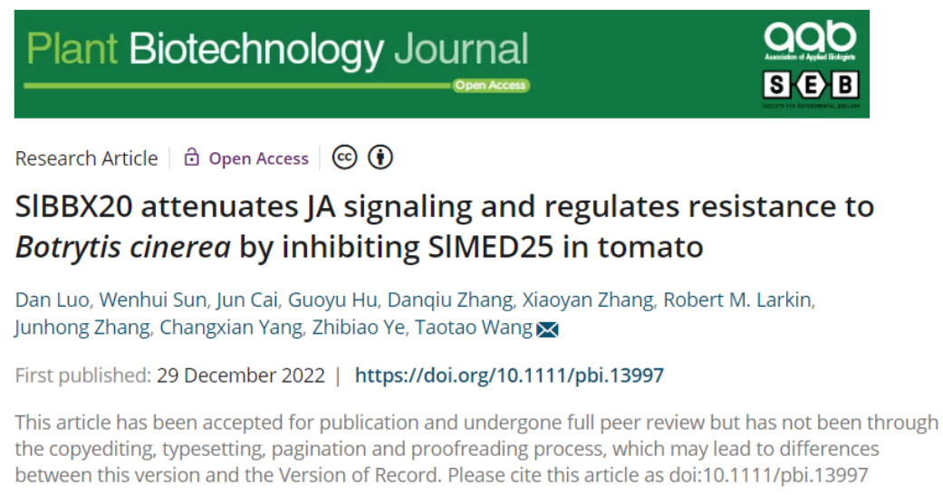 近日,51吃瓜网 番茄团队王涛涛教授课题组在国际权威学术期刊《Plant Biotechnology Journal》发表了题为《SlBBX20 attenuates JA signaling and regulates resistance toBotrytis cinereaby inhibiting SlMED25 in tomato》的研究论文。茉莉酸(JA)在调节植物生长和防御反应中发挥着重要作用,研究发现SlBBX20可调控JA的各种响应反应,是一个新的JA响应的负调控因子,JA与灰霉病的抗性密切相关,当过量表达SlBBX20时,番茄对茉莉酸的响应被抑制,导致番茄对灰霉病的抗性减弱。相反,当敲除SlBBX20基因后,JA响应增强,同时显著增强了番茄对灰霉病的抗性。