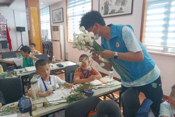 活动伊始,志愿者胡笳言为小朋友科普了此次活动用到的花材:月季、小菊、康乃馨和尤加利叶,详细讲解了每种花材的别称、地位、药用价值、生态价值。接着,胡笳言同学讲述了作为中华传统艺术之一——插花艺术的历史渊源与其背后蕴含的文化内涵,小朋友们紧跟课堂,积极回答问题。同时,志愿者李林星结合专业知识,简单展示了插花技巧,她提醒道:“插花是心灵的表达,每一个作品重要的是它的含义,而它的形式不需要太过注重。”