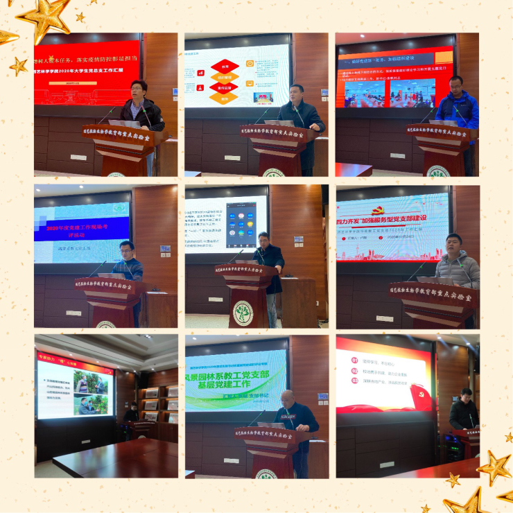 茶学系教工党支部从理论学习、校地共建助力企业重振以及决战脱贫攻坚三个维度总结了2020年的党建工作;风景园林系教工党支部则立足基层党建工作,深入阐明了支部战斗堡垒作用的发挥情况及支部书记履职尽责情况;果树系教工党支部创新型“党支部+”建设模式,让支部党员形成群体效应,为支持产业、扶持产业提供组织保障;行政教工党支部以“‘四力齐发’加强服务型党支部建设”为主题,汇报了服务型党支部建设的情况;蔬菜系教工党支部及重点实验室党支部展示了支部成员火线战疫、坚守岗位、下沉社区、靠前服务的事迹,真正在防控疫情斗争中经受考验,做到守土有责、守土尽责;园林系教工党支部以加强组织建设为切入点,重点阐述援藏教师感人事迹,突出展现党员先锋模范作用;大学生党总支汇报了一年以来在学生思想引领建设方面的工作成效。