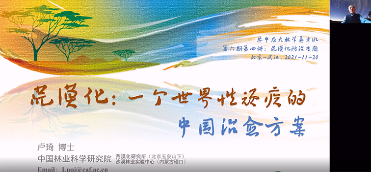 卢琦研究员在线做了题为“荒漠化:一个世界顽疾的中国治理方案”的精彩报告,报告围绕“沙漠从哪里来到哪里去”、“大国实践可示范”、“中国方案益全球”等3个篇章,将沙漠化治理的科学研究、实践、中国成功经验等进行了系统和全面介绍。报告结束后,围绕部分同学、老师提出的问题,卢琦研究员与相关人员进行了交流。
