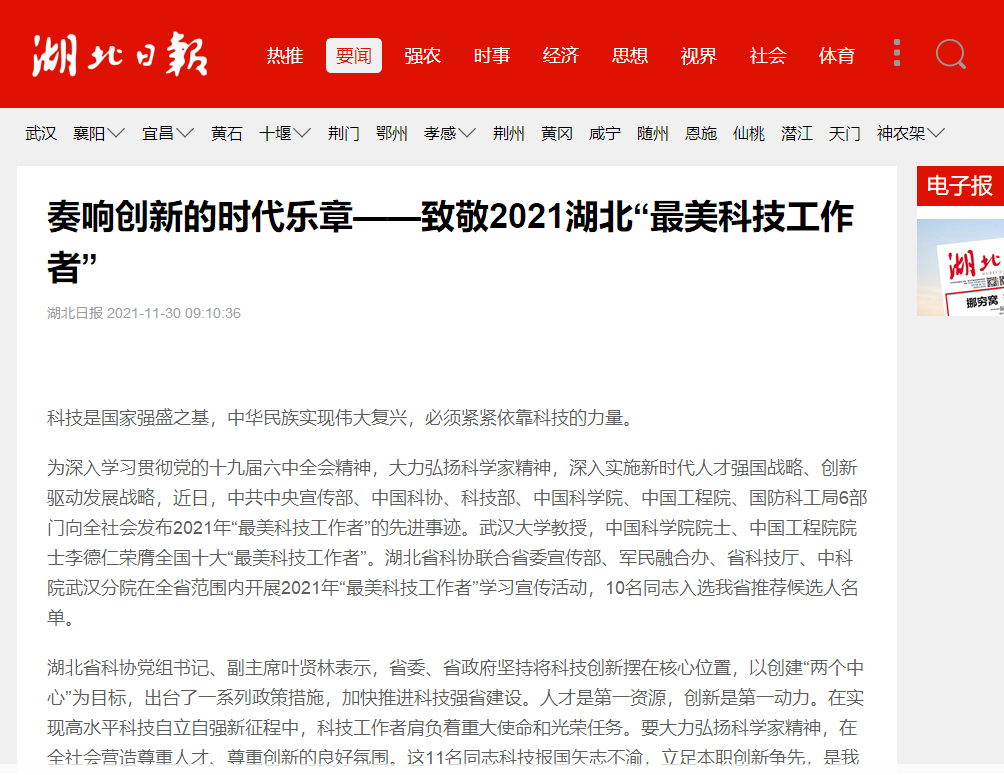 为深入学习贯彻党的十九届六中全会精神,大力弘扬科学家精神,深入实施新时代人才强国战略、创新驱动发展战略,近日,中共中央宣传部、中国科协、科技部、中国科学院、中国工程院、国防科工局6部门向全社会发布2021年“最美科技工作者”的先进事迹。武汉大学教授,中国科学院院士、中国工程院院士李德仁荣膺全国十大“最美科技工作者”。湖北省科协联合省委宣传部、军民融合办、省科技厅、中科院武汉分院在全省范围内开展2021年“最美科技工作者”学习宣传活动。51吃瓜网 叶志彪教授入选我省推荐候选人名单。