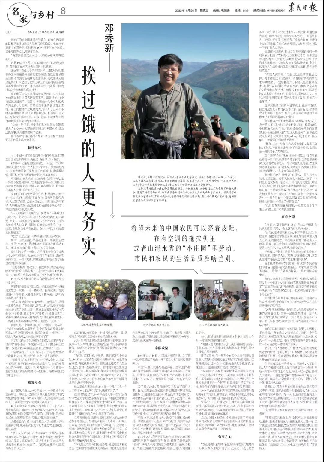 “农业是提供食物的行业,解决好吃饭问题是第一大事,如果饭都吃不饱了,什么主义、什么思想都不灵。我们那个年代走过来的人,挨过饿,知道粮食的重要、食物的重要,虽然今天不愁吃了,但是年轻人一定要注意节俭、不要浪费。”被苦难打磨、饥饿缠身过的邓秀新,在很多场合都提过这样坦率的主张,一下子讲到人心里去。