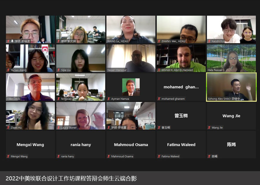 2022年5月27日,“2022中美埃联合设计工作坊课程”课程答辩在线上顺利开展。本课程面向2021级风景园林学研究生授课,教师团队为邵继中、王玏、张炜和章莉。答辩邀请到美国克莱姆森大学Hala Fouad Nassar教授,CU-ICAR副总监Mike Davis先生和Laura Stoner女士,以及埃及艾因沙姆森大学Yasser Mansour教授、Ayman Farid副教授与Ahmed Khaled副教授等六位嘉宾,与风景园林系师生共同进行交流探讨,开展产学研深度融合的国际联合设计课程评图。