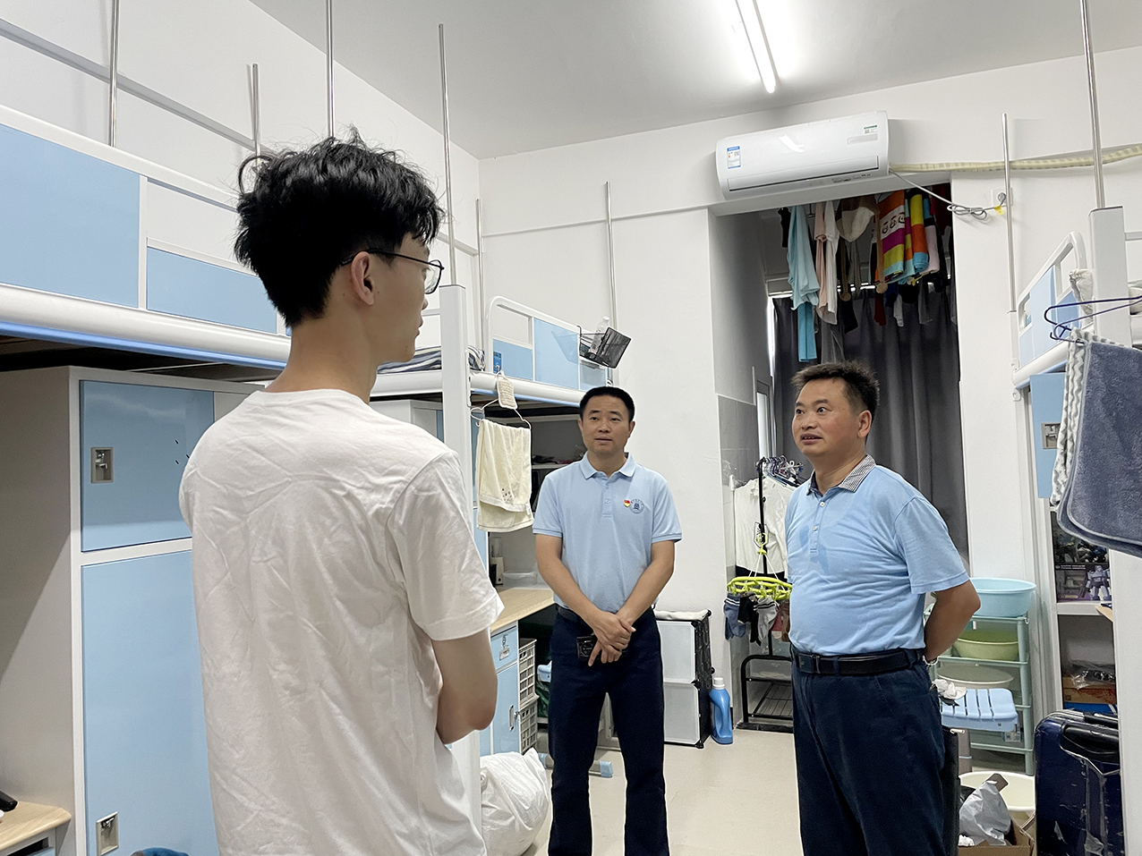 在宿舍区,张宏荣与毕业生亲切交流,了解学生基本情况和后续学习工作计划,勉励大家珍惜时光、勤奋学习。程运江谈到,随时欢迎同学们对学院的工作提出意见和建议,从而发现问题,不断改进。希望同学们一如既往地关心和投入学院的各项改革发展事业中,善于思考,为个人成长和学院发展积极贡献力量。