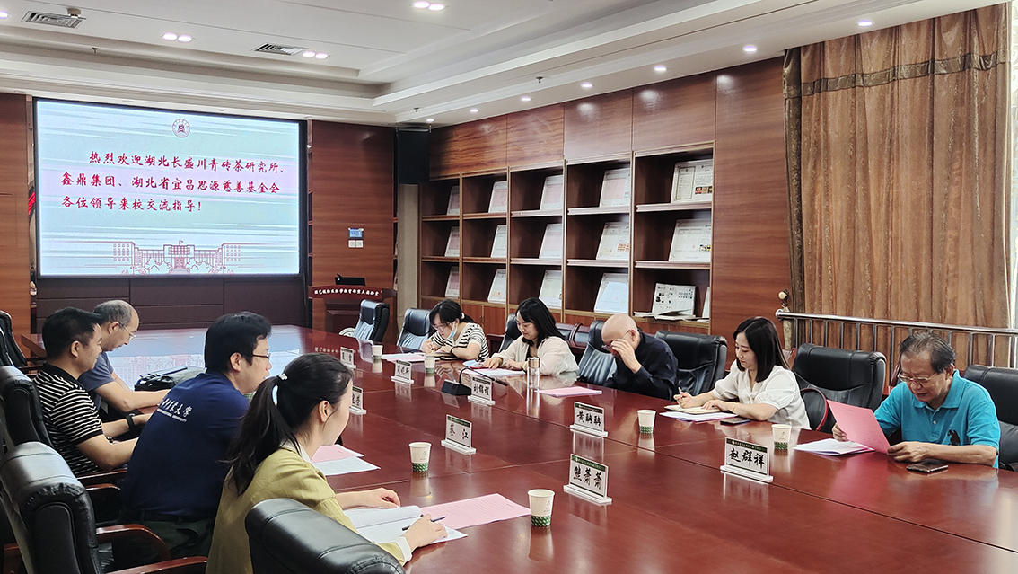 9月21日上午,“鑫鼎・长盛川青砖茶奖助学金”座谈会于园林南楼206会议室举行。湖北长盛川青砖茶研究所副所长、秘书长刘锦程、鑫鼎集团综合管理部副部长黄聃聃、湖北省宜昌思源慈善基金会顾问赵群祥等企业代表和学院党委书记张宏荣、教授倪德江出席了座谈会。会议由学院党委副书记蔡江主持。