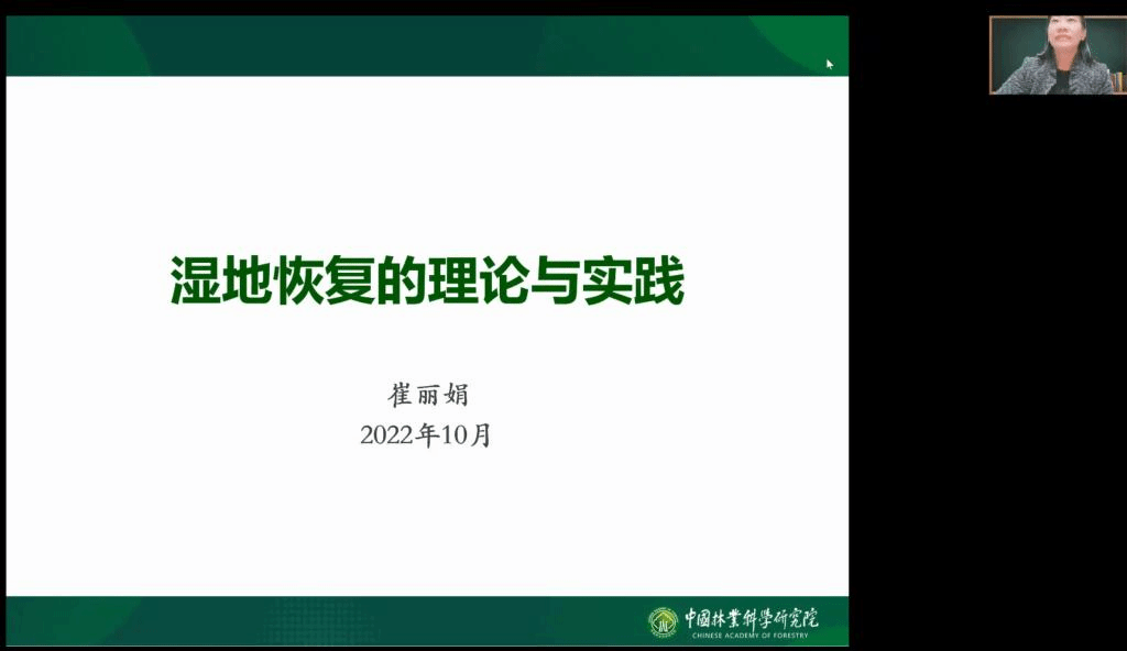 在首场专家讲座中,崔丽娟研究员作为题为《湿地恢复的理论与实践》的精彩报告,从全球和我国洞庭湖、洪湖、东北泥炭湿地等重要湿地退化问题开始,围绕湿地退化状态与特征、湿地回复的国家需求、湿地恢复的理论与管理的理念、湿地恢复的方案设计、湿地恢复实践案例与经验、湿地恢复的思考等方面,结合湿地研究团队开展的相关研究和实践工作,系统阐述了我国湿地保护与恢复理论和技术体系。在讨论环节中,崔丽娟研究员围绕提出的问题,介绍了即将召开的COP14会议、湿地恢复知识学习等问题,报告受到线上线下参会人员的热烈欢迎。