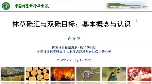 在12月2日晚上进行的讲座中,肖文发研究员作了题为《林草碳汇与双碳目标:基本概念与认识》的精彩报告,报告从人类与碳、林草碳汇有多大、森林有机碳的形成暨碳汇与碳中和、森林碳汇监测与计量、森林碳汇价值及交易与核证等五个方面系统介绍了林草碳汇体系与双碳目标间的关系及实现机制,分析了政策趋势与科学研究趋势,报告内容结合大量数据、政策文件和实践工作,系统、深入、瞄准前沿问题,并将科学、政策、实践相结合;报告结束时,作为华农校友肖文发老师对林学英才班和科研案例课程学员提出了殷切期望,指出学习中要积累经验,能力提高、发挥优点特长,并强调科学研究中要乐于吃苦、勇于战斗、重于事实、善于团结。该场报告也有来自中国林科院京内及京外相关院所、国家林草局调查规划院、湖北省林科院、武汉市园林和林业局等相关单位的人员在线同步参加。