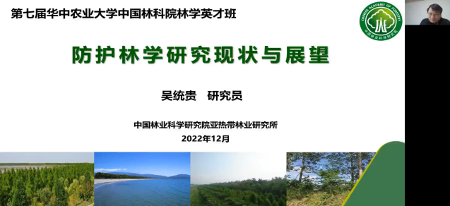 在12月3日上午举行的讲座中,吴统贵研究员围绕“防护林学研究现状与展望”这一主题做了精彩报告,他并从防护林学的内涵、发展历史和世界重大防护林工程、防护林构建理论与技术、经营理论与技术、效益评价、研究趋势展望等六个方面对防护林科学的发展和基本原理及发展趋势需求等进行了系统介绍,最后系统介绍了亚林所在防护林学方面开展的科研案例工作,报告结束后,吴统贵研究员与参与报告的师生就相关问题进行了交流探讨,并介绍了亚林所研究生培养相关工作。来自我校林学英才班和科研案例课学员与相关单位师生、科研人员等近百人在线同步参加。