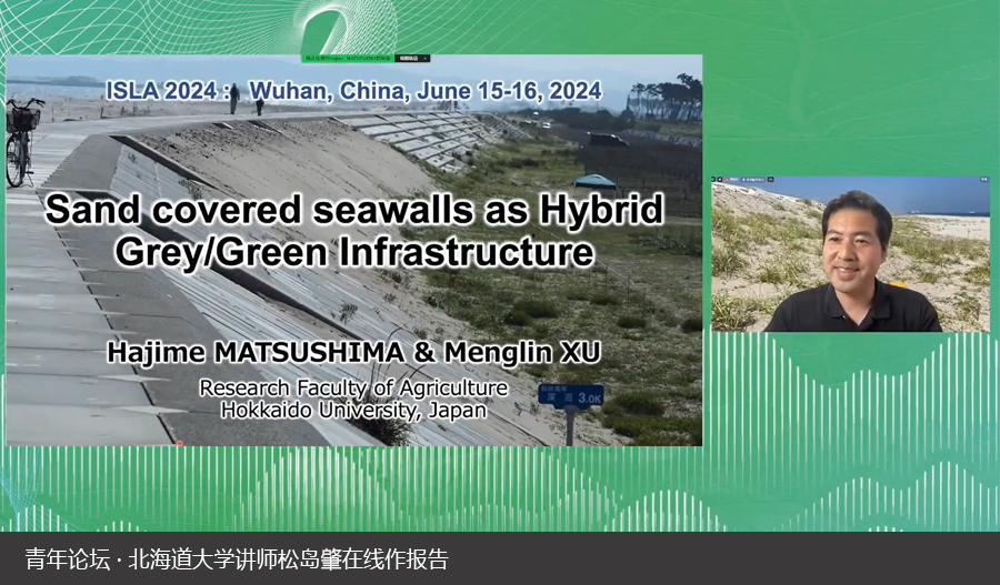 北海道大学讲师松岛肇博士为与会者带来了题为“沙丘覆盖海堤作为混合灰/绿基础设施”的报告。该研究聚焦于海岸生态系统的恢复与自然基础解决方案(Nature-based Solutions)的应用。松岛肇在报告中探讨了海岸沙丘生态系统的重要性,以及如何通过绿色基础设施来增强海岸线的生态功能和审美价值。他们以日本宫城县的海岸防护林和海堤恢复项目为例,展示了在面对自然灾害时,如何利用自然力量和本土植物种类来恢复和增强海岸线的生态服务。
