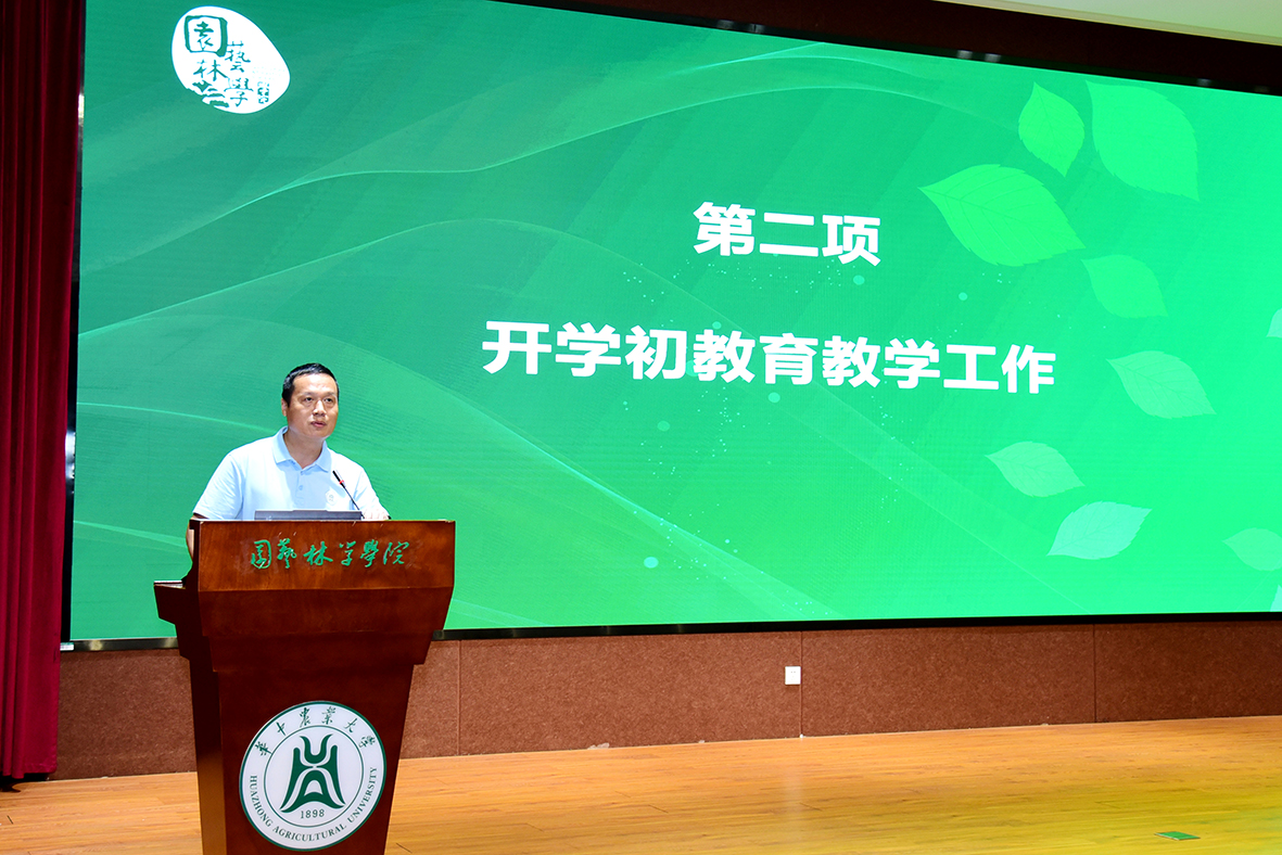 学院副院长周继荣开展开学教育教学工作部署,他指出在教学方面,教务老师要加强与任课老师的沟通,确保教学工作顺利开展,同时任课老师需加快完成教材编写、课程建设等教学任务。在教育方面,要做好新生入学教育与安全教育,引导学生健康健全地成长成才。最后,他通报了学院智慧园艺实践教学基地工程的建设进度。