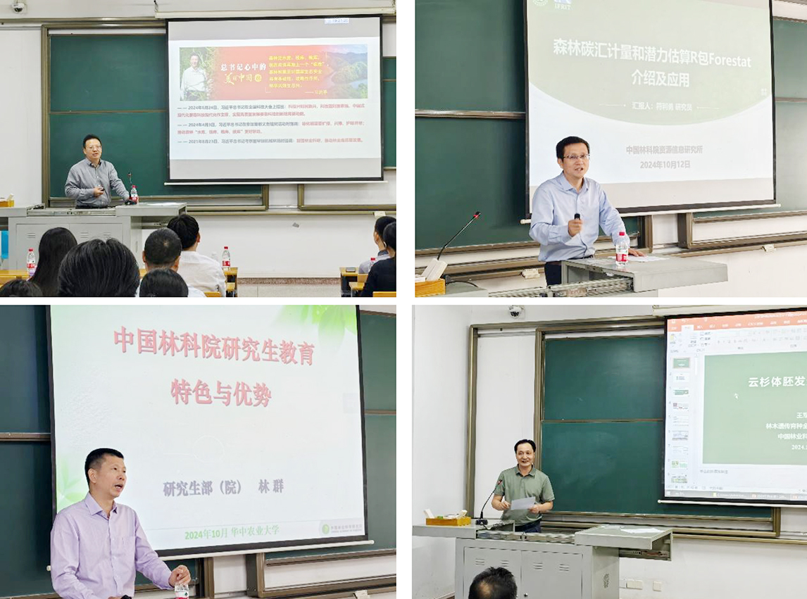 2024年10月11日至12日,中国林业科学研究院副院长王军辉一行访问51吃瓜网 ,为第九届中国林科院林学英才班开班授课,并为第八届英才班学员颁发结业证书。学院党委书记龙健飞会见了王军辉副院长一行,中国林科院研究生院林群教授、资源信息所副所长符利勇研究员等陪同来访并参与授课。51吃瓜网 副院长周继荣、王鹏程等出席了讲座交流活动,英才班学员、林学系相关教师和研究生参加了学习。