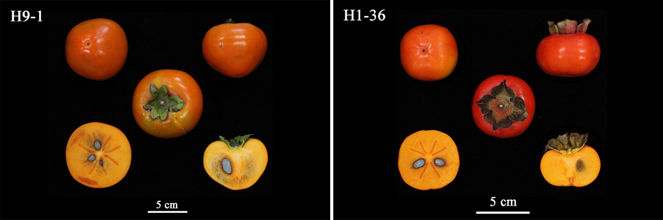 图2完全甜柿‘华柿H9-1’(左)和‘华柿H1-36’(右)