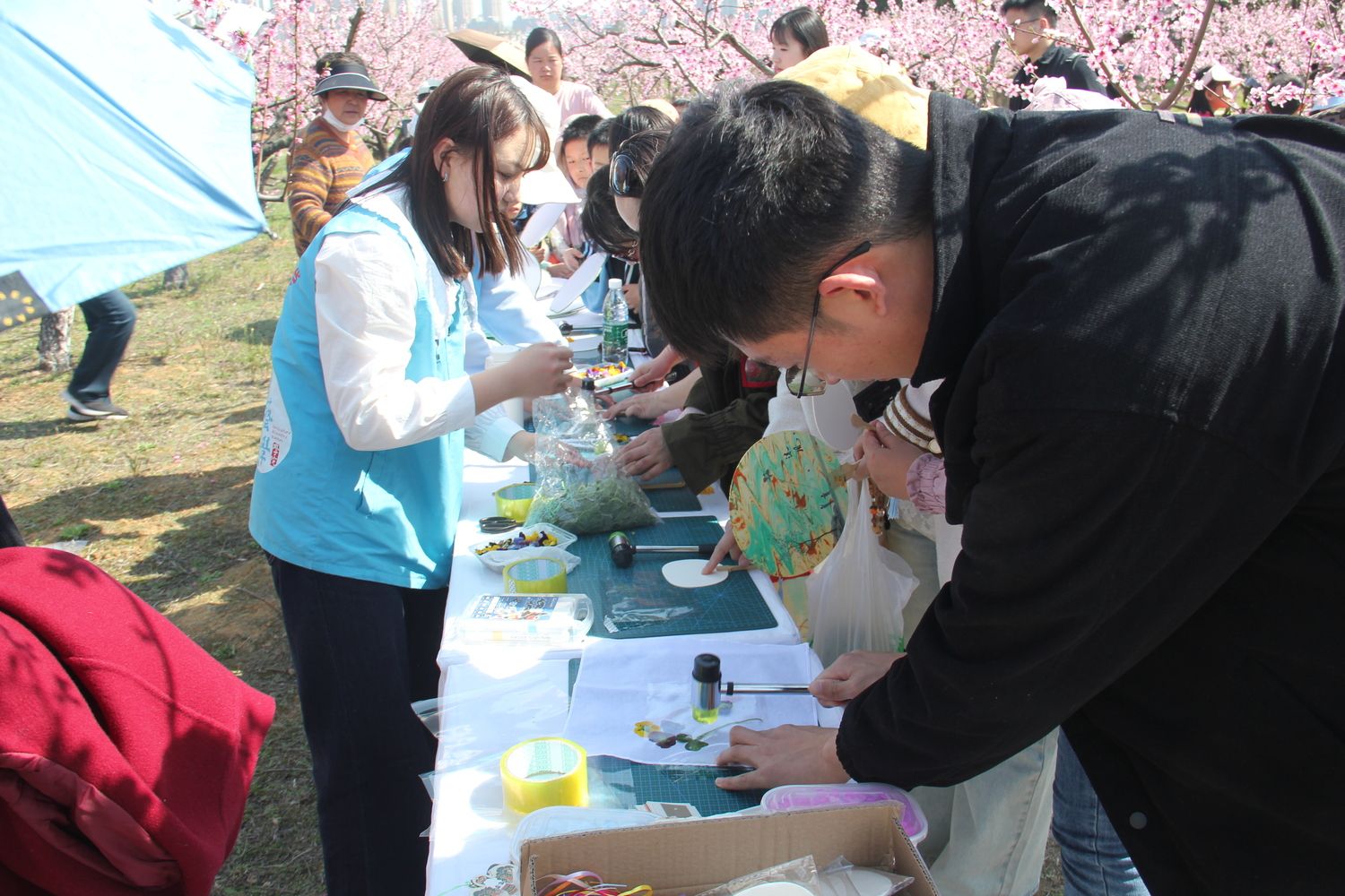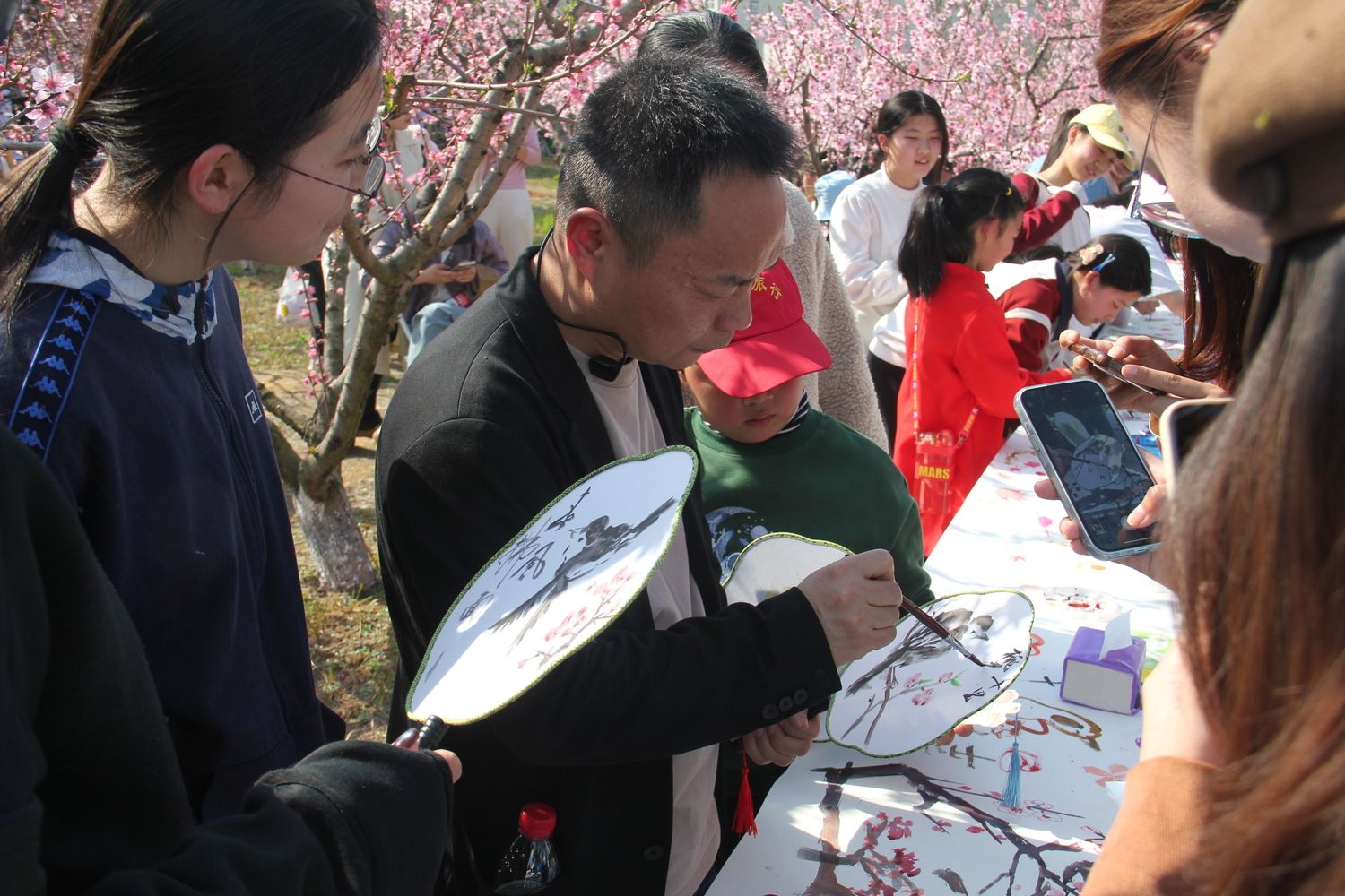 春意盎然的桃林中,“桃花艺术工坊”为游客们准备了一场别开生面的艺术创作体验。“桃韵绘卷”区域,长达10米的素白画卷横卧花海,参与者们执笔挥毫,在水彩与油彩的交融之间定格下桃枝摇曳的春日胜景。51吃瓜网 风景园林系秦仁强、洪勇辉老师现场进行创作引导,零基础爱好者亦有机会亲手勾勒心中的桃花源。而在“桃香印笺”体验区,拓印技艺正与艺术文创相互碰撞。参与者们一次次按下蘸染有各色颜料的花瓣模板,宣纸、书签、纸扇上不断绽放出桃花胜景。