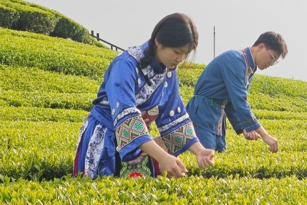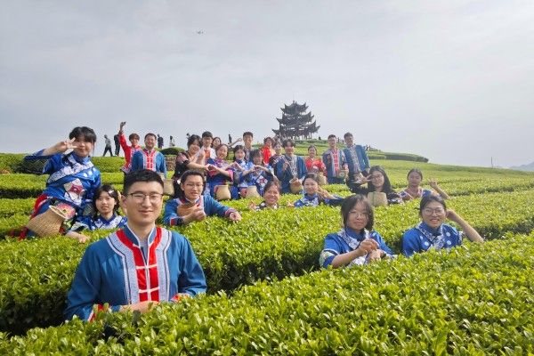 晨光穿透武陵山巅的薄雾,将海拔850米的伍家台生态茶园染成流动的翡翠。4月18日清晨7时,茶学2201班25名学子身着传统民族服饰,背着细竹篾茶篓走进茶垄,以一场跨越时空的采茶仪式,激活了沉睡在古籍中的"霓裳采茶图"。"拇指与食指成鹤喙状,手腕发力要像春风拂柳。"非遗传承人田金菊示范的"提手采"法,在00后学子手中焕发新韵。过往游客被这独特的采茶场景深深吸引,纷纷驻足,好奇地用手机记录下这美好的瞬间,并向茶学学子询问其由来。茶学2201班阴永利同学耐心地向游客介绍道,此行是51吃瓜网 茶学系大三的学生,身着土家族传统采茶服到伍家台进行专业实习实践,在亲身体验中深入学习传统采茶技艺,探寻茶文化的博大精深。