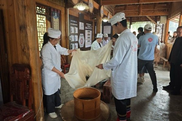 在揉捻环节,孙晓慧同学双臂如抱圆球,按照传统技艺要求,运用 “三轻三重” 的原则,以团揉与推揉相结合的方式,熟练地推揉着茶团,同时还不忘向围上来的游客进行讲解:“传统揉捻工序中蕴含着深厚的经验智慧,讲究‘三轻三重’,如此才能使茶叶在后续的制作过程中更好地展现其品质与风味。”游客们听后频频点头,纷纷拍摄记录这珍贵的非遗传承场景,对这一传统技艺的独特魅力赞不绝口。