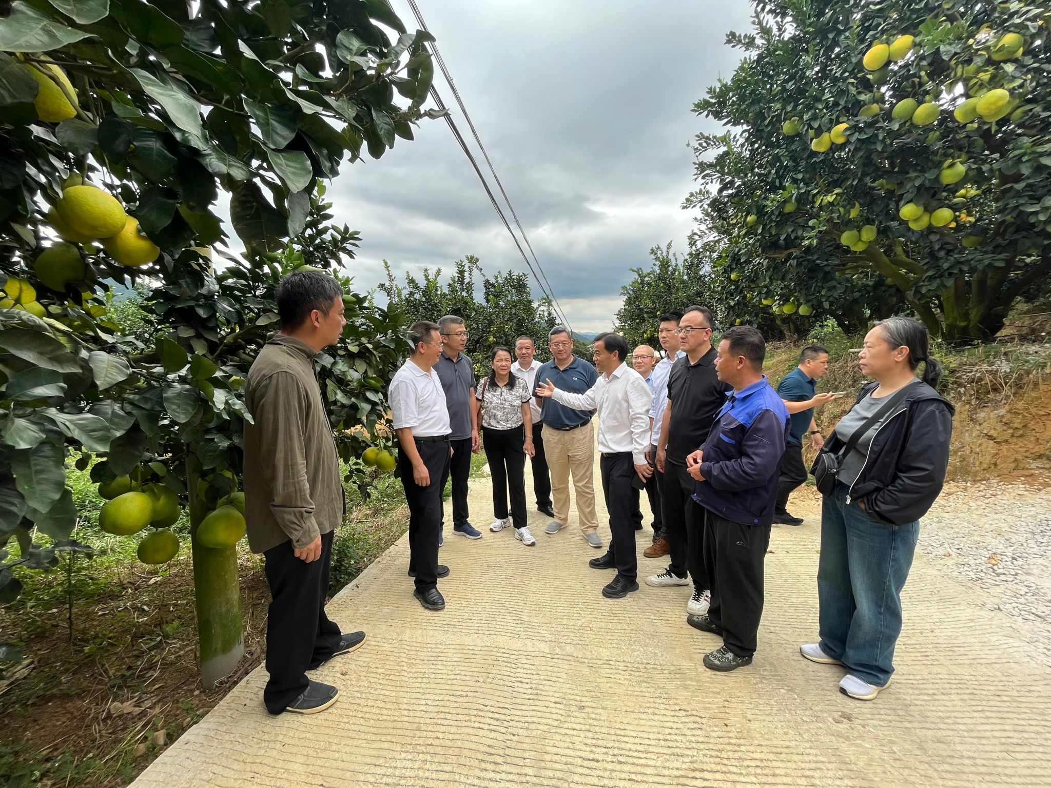 一行人在梅县区雁洋镇仿桂园家庭农场实地调研金柚种植情况。农民日报全媒体记者 吴砾星 摄