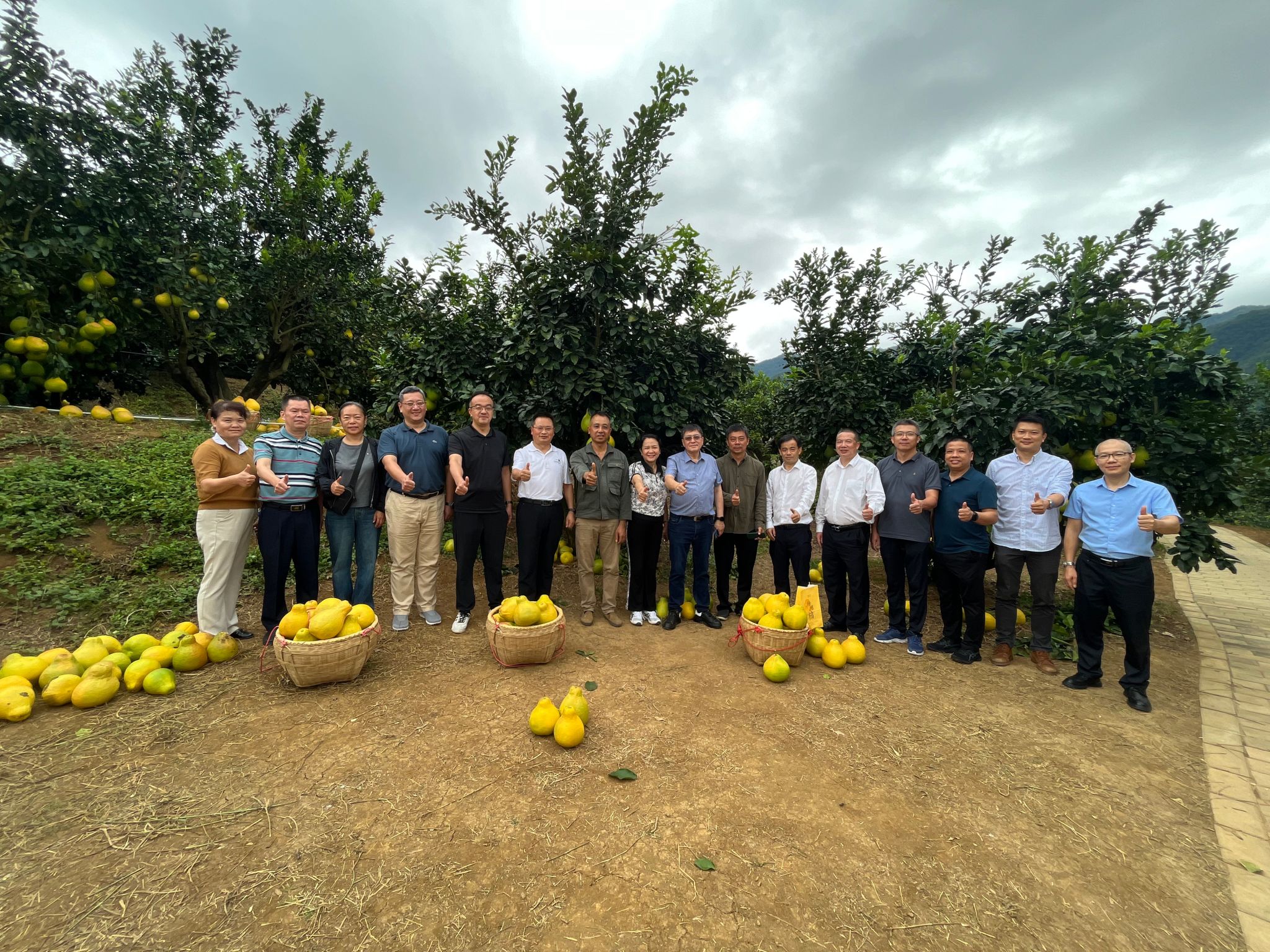 专家与村民在雁洋镇南福金柚种植基地总书记发表讲话处合影。马瑞丰 摄
