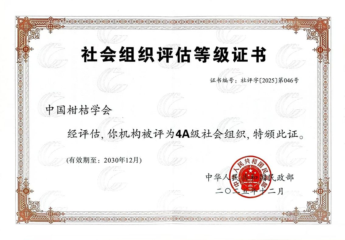 近日,民政部正式授予中国柑桔学会“国家4A级社会组织”称号,这是学会首次接受由民政部组织的全国社会组织评估,也是自成立以来首次获得这一国家级荣誉,标志着学会在规范化建设、专业服务与内部治理等方面取得重要进展。