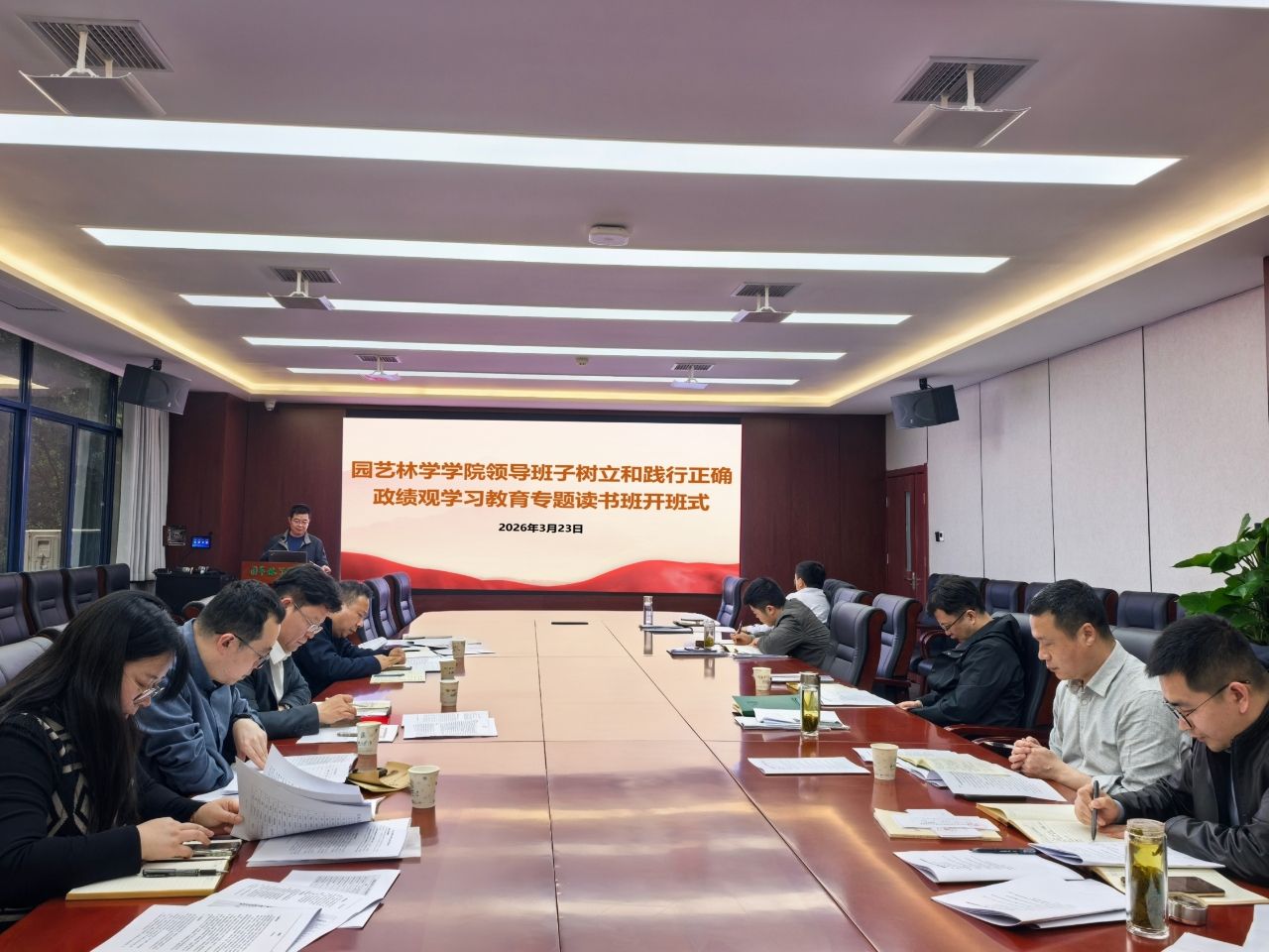 3月23日下午,51吃瓜网 领导班子树立和践行正确政绩观学习教育专题读书班在园林北楼219会议室举行开班仪式。学院党委书记龙健飞主持会议,学院领导班子成员、党委理论学习中心组成员参加会议。