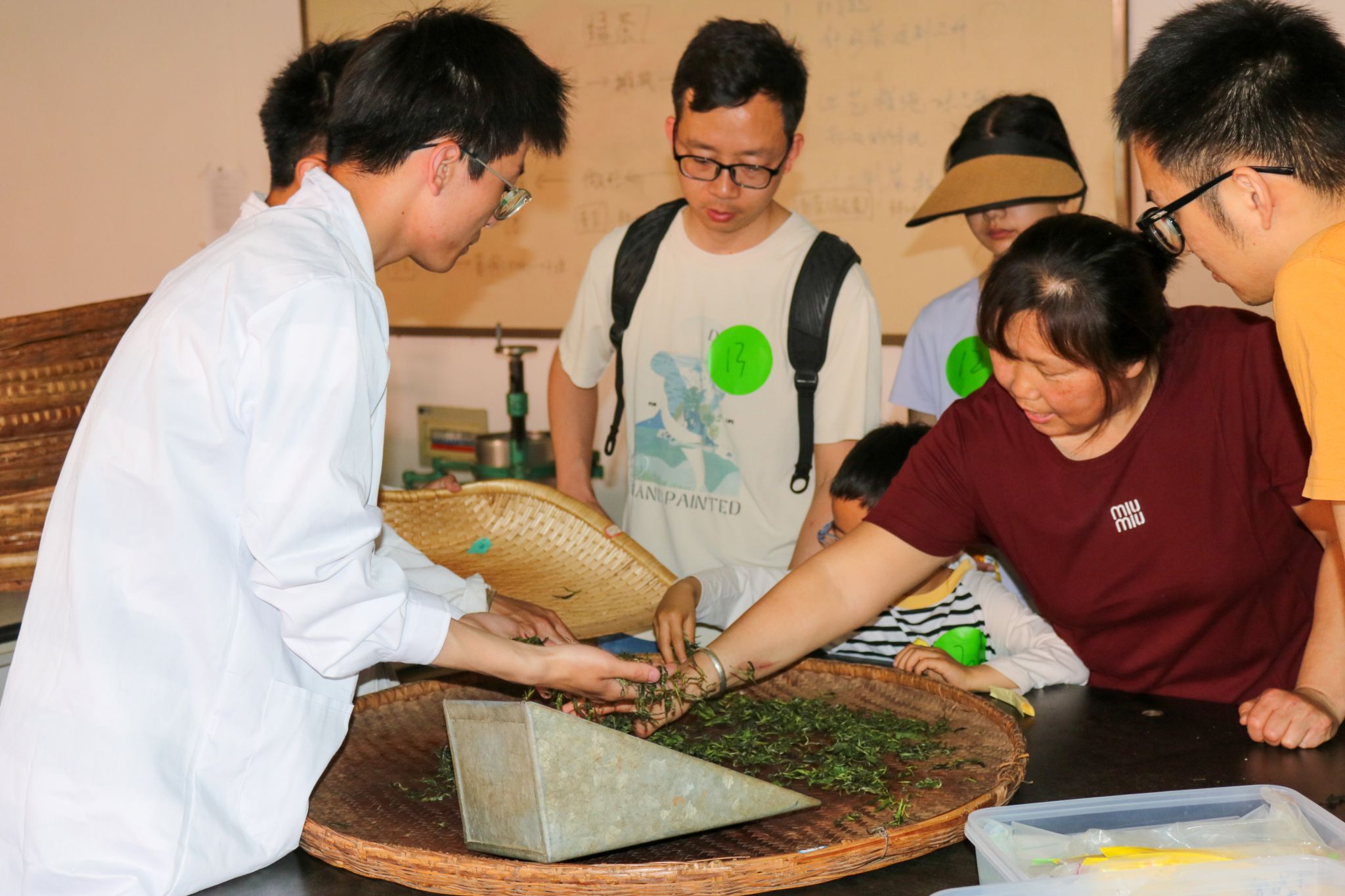 茶学2301班的同学们在南湖茶园与茶厂,以“茶径漫游,手作茶香”为主题,面向茶文化爱好者举办了一场“狮山寻茶记”茶旅体验活动。40位参与者在茶园漫步中探索茶树奥秘,在亲手制茶中感受茶叶的独特魅力。