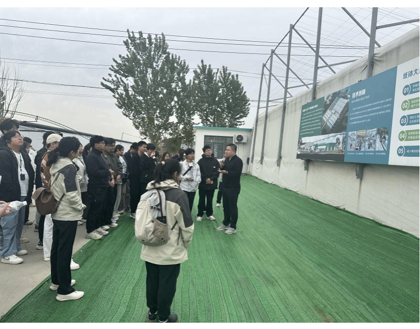 下午,师生走进中国冬暖式蔬菜大棚发源地三元朱村,了解该村在王乐义书记带领下的奋斗历程,感悟“敢为人先、无私奉献、共同富裕”的大棚精神。在第六代冬暖式大棚内,同学们学习了纸载带条育苗移栽技术,观摩沙子无土栽培等配套技术,直观感受智能化大棚的提质增效成效。