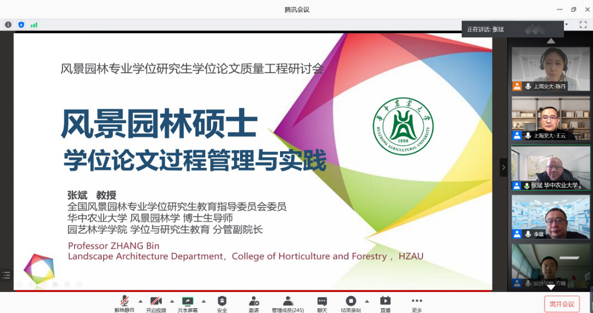 12月13日,全国风景园林专业学位论文质量工程研讨会在线召开,会议由全国风景园林专业学位研究生教育指导委员会主办,上海交通大学设计学院风景园林系承办。会议旨在推进风景园林专业学位论文撰写规范、学位论文标准。教指委秘书长、北京林业大学副校长李雄出席并讲话,全国风景园林师生600余人在线参会。我校张斌教授代表教指委质量保障与促进组,做题为《风景园林硕士学位论文过程管理与实践》的专题报告。